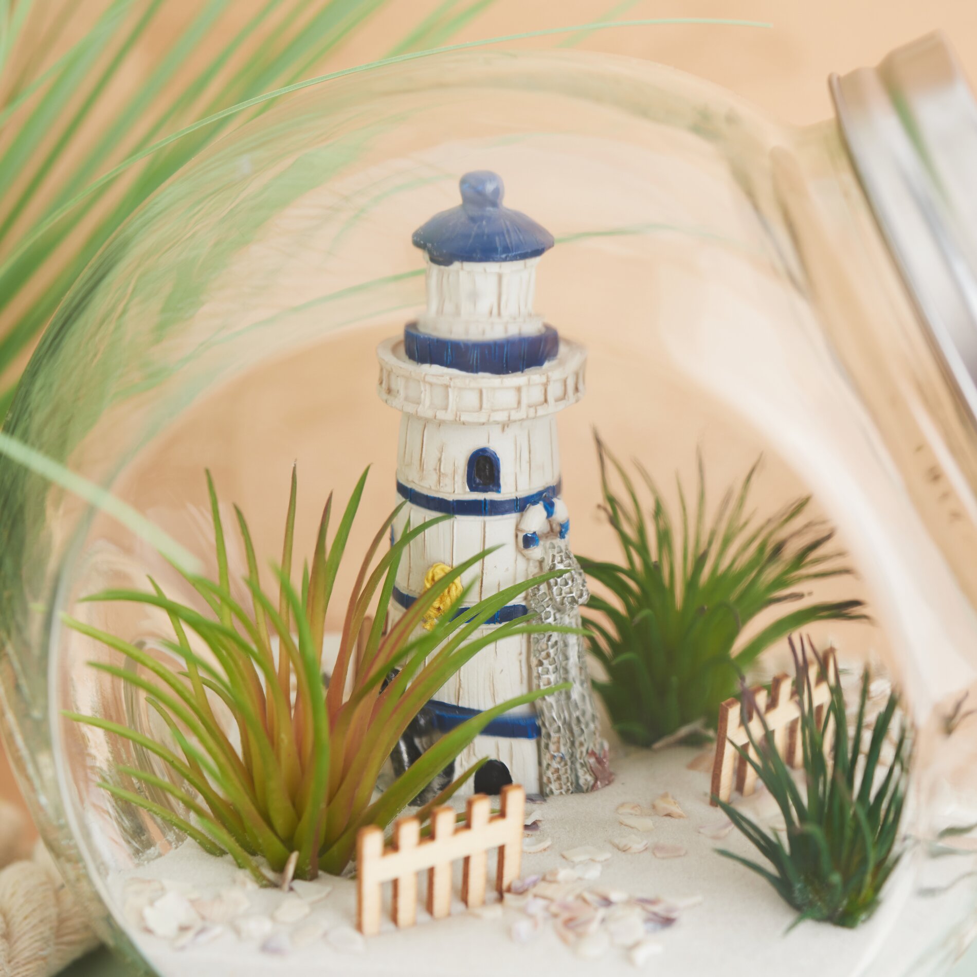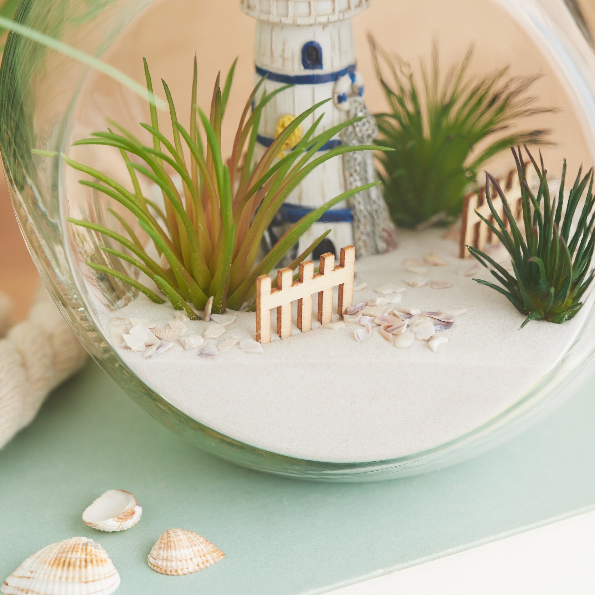 Neem de zijkniptang en knip de stengels van je vetplanten op een lengte zodat ze rechtop in het glas kunnen staan. Zet ze vervolgens op zand, zodat ze stabiel staan en er goed uitzien. Voeg andere accessoires toe om je vuurtorenlandschap compleet te maken: plaats kleine schuttingelementen in de zand en strooi schelpkorrels op het zandoppervlak.