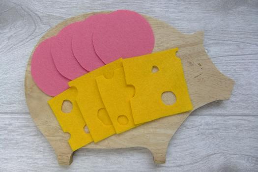 Knip ronde cirkels uit roze vilt voor de worst en vierkanten met onregelmatige gaten uit gele vilt voor de kaas. Je kunt ook gewoon een glas of iets anders ronds gebruiken als sjabloon . Zo maak je een heerlijk kaas- en worstplateau.