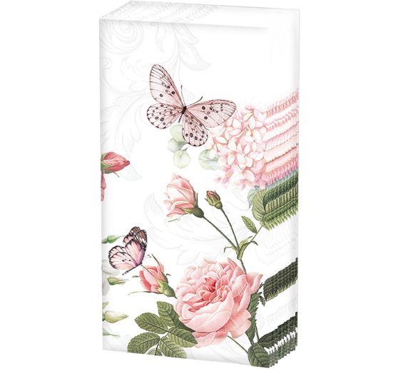 Breng de lente in huis met de betoverende papieren zakdoekjes "Amelia". De romantische motieven van delicate rozen en vlinders stralen een frisse, levendige sfeer uit. Je kunt de servettentechniek gebruiken om deze lentepracht over te brengen op allerlei oppervlakken, zoals keramiek, glas of stof. Maak unieke decoratieve objecten zoals bloempotten of fotolijstjes. De servet meet 21 x 21 cm en biedt je vier vergelijkbare motieven om creatief mee aan de slag te gaan. Laat je fantasie de vrije loop en maak blijvende kunstwerken!