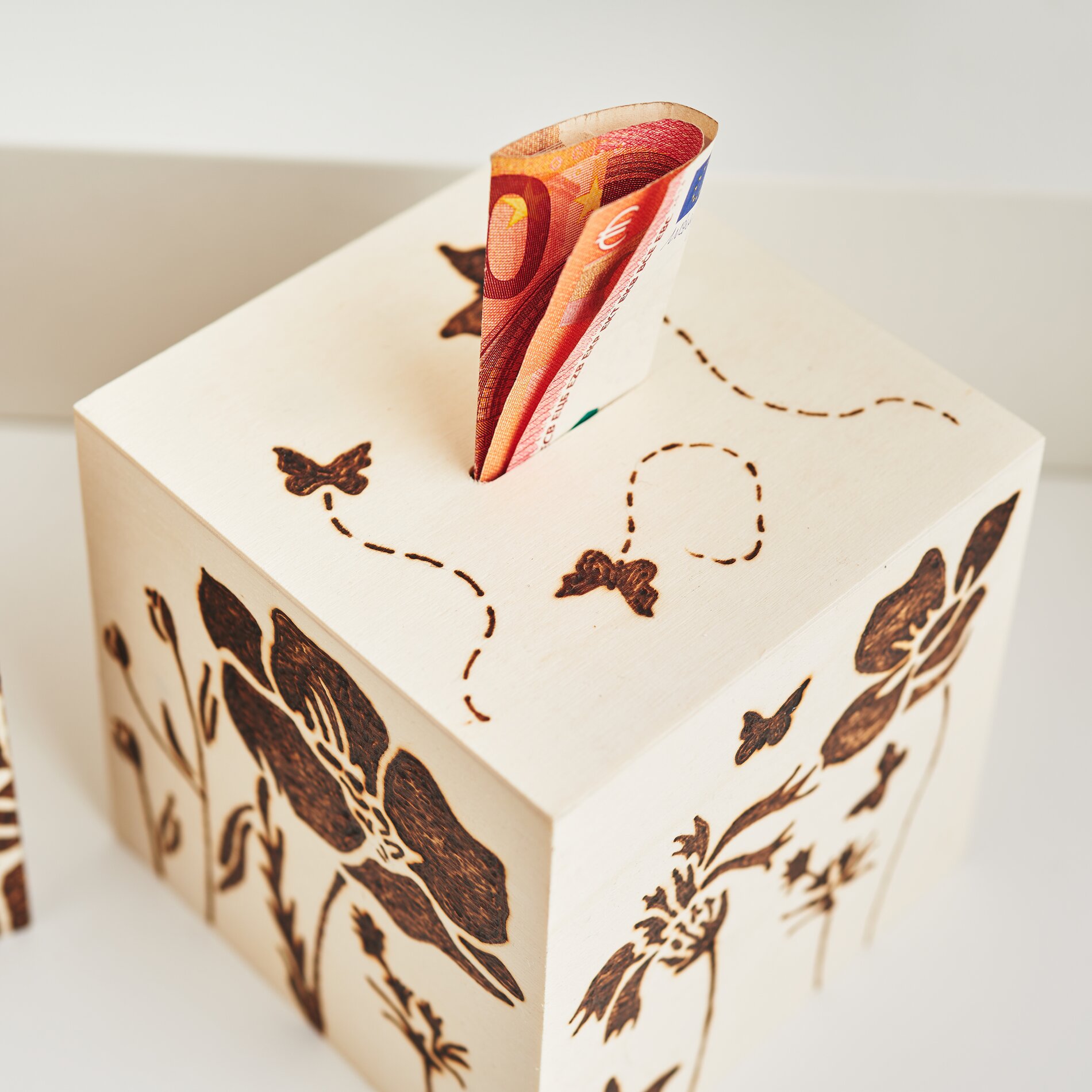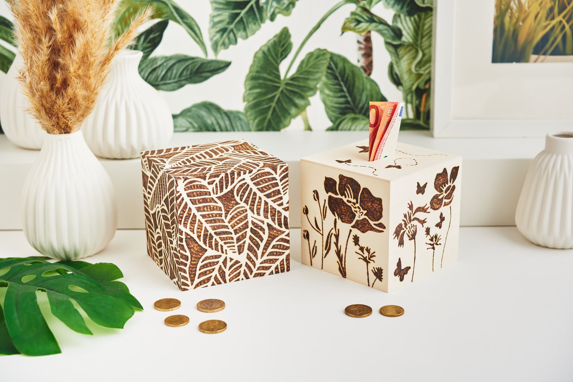 Ontwerp je eigen houten spaarpot met houtbrander schilderen. Ontdek bijpassende spaarpotten, sjablonen en merklappen in onze online shop en begin nu met je volgende knutselproject! Verander hout in een gepersonaliseerd kunstwerk - we wensen je veel plezier bij het ontwerpen!