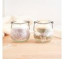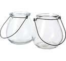 VBSlantaarn van glas met een hoogte van ca. 10,8 cm en een buiten-Ø van ca. 10 cm. U ontvangt 2 lantaarns. De opening aan de bovenkant heeft een Ø van ca. 5,5 cm en de voetafdruk is ca. 6,5 cm. Aan de bovenkant van de rand is een draadhanger bevestigd waarmee de lantaarn kan worden opgehangen.