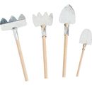 Dit gereedschap is perfect om je creatieve projecten naar een hoger niveau te tillen. Met een grote schep, een kleine schep, een spadevork en een hark van zilverkleurig metaal en houten handvatten ben je perfect uitgerust voor het maken van miniatuurlandschappen, diorama's of poppenhuizen. Stel je voor hoe je kleine plantjes kunt maken met de kleine schop of filigraanstructuren in het zand kunt maken met de hark.